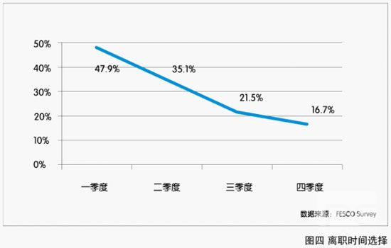 從調(diào)研結(jié)果看,員工的離職高峰期集中在第一季度,接近50%.春節(jié)后成為員工跳槽的高發(fā)期,其后的三個(gè)季度中,離職率逐季下降。這成為一種普遍規(guī)律,不同群體間差異性不大。