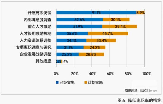 從調(diào)研結(jié)果看,企業(yè)在員工保留方面采取的措施主要以開展離職訪談為主,同時(shí)借助內(nèi)部滿意度調(diào)研和實(shí)施重點(diǎn)人才保留與激勵(lì)措施來(lái)達(dá)到保留員工的目的,如圖五所示。