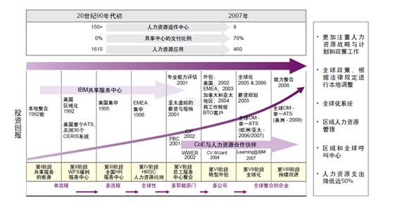 在經(jīng)歷了持續(xù)不斷的創(chuàng)新實(shí)踐后,到2007年,IBM的人力資源轉(zhuǎn)型達(dá)到了一個(gè)嶄新的高度:它在組織運(yùn)營層面實(shí)現(xiàn)了共享服務(wù)中心,專家中心和人力資源合作伙伴架構(gòu),成功地保持了企業(yè)和員工的競爭性并為客戶提供“思想領(lǐng)導(dǎo)力”。通過變革人力資源管理,IBM成功地降低了人力資源成本,提升了企業(yè)的投資回報(bào)。