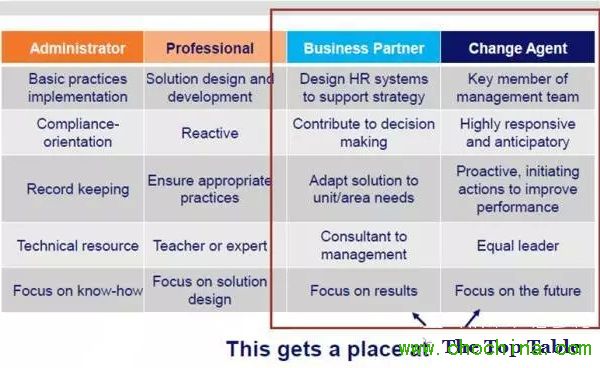 而david ulrich定義的另一個角色,change agent的角色,在我的實踐中間,多數(shù)是由HRBP這個角色來承擔(dān)的,這也是很多企業(yè)對于HRBP有比較高的期望的原因。
